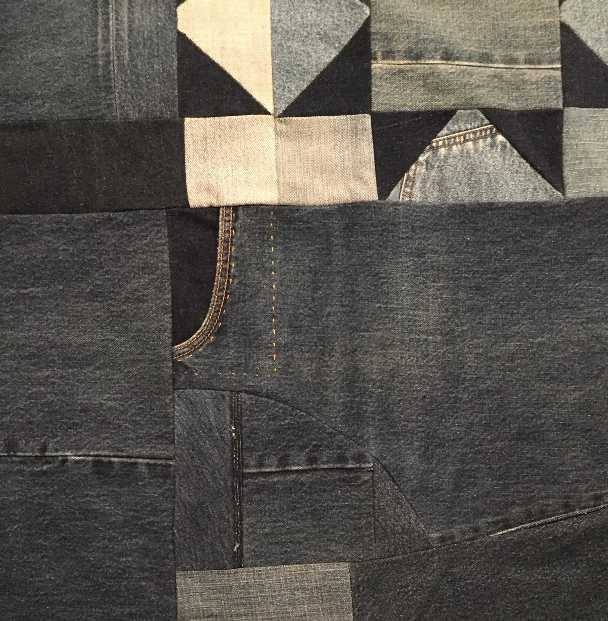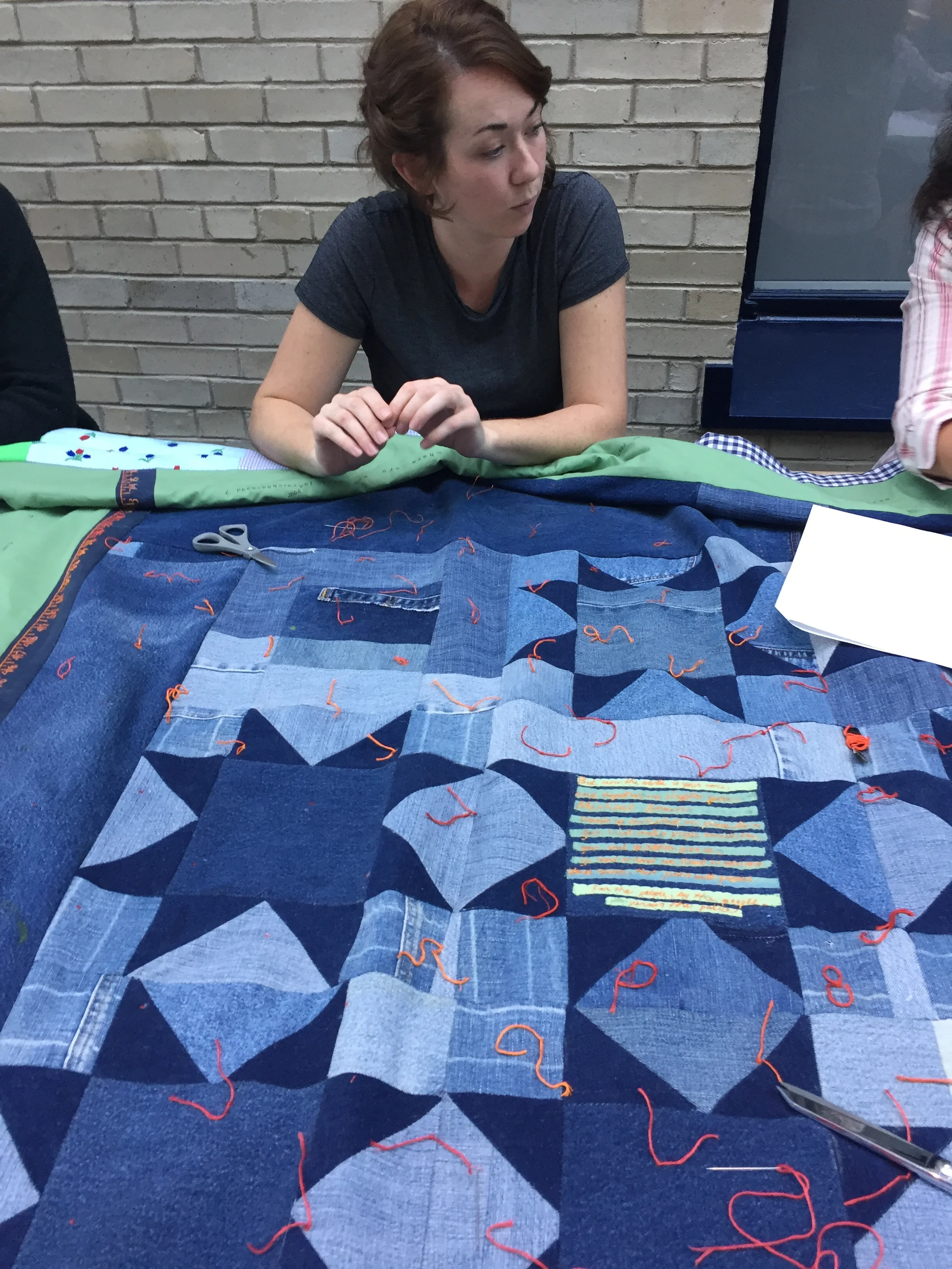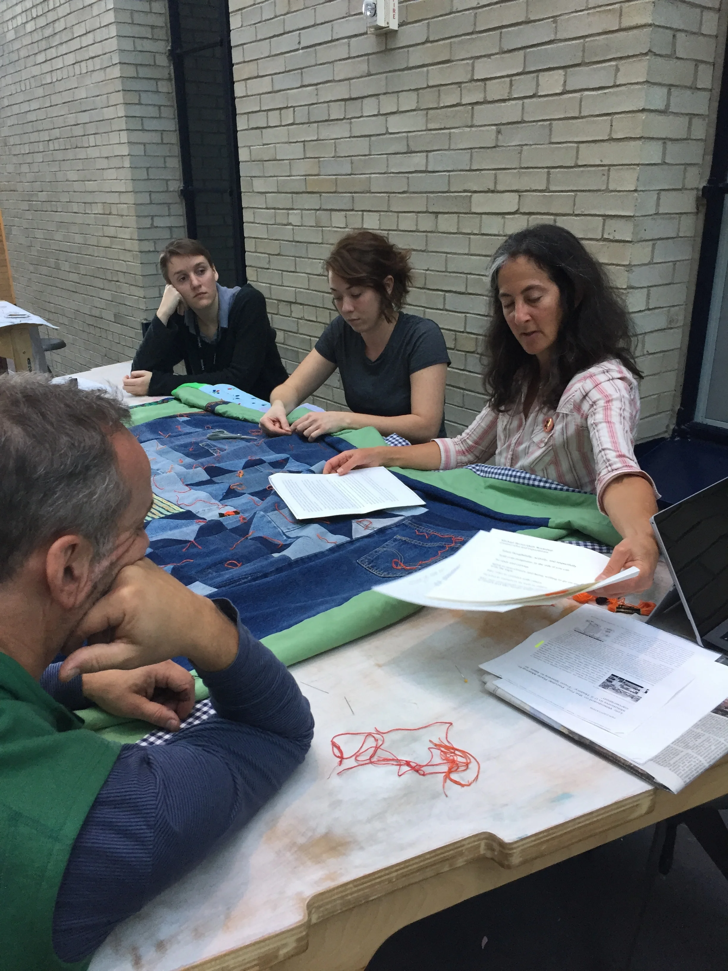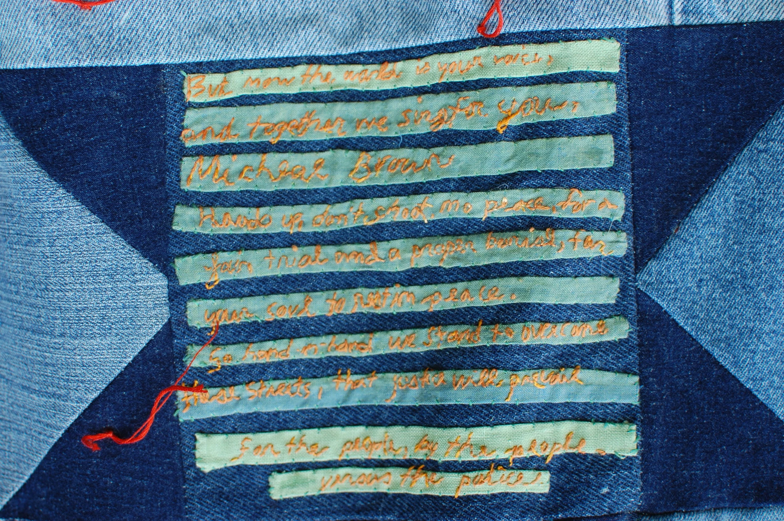 It is important to remember that in many ways our current society at large is more racially divided than the small but effective abolitionist movement of 150 years ago. The delicate calicos and finely inked cursive of the 1836 quilt are rendered here in rough denim and equally coarse embroidery, as a comment on the class and gender restrictions that shaped women’s practice of needlework in the 1800s, and as a requiem to the esthetics, syntax, and fine handwork that have been lost as our society has evolved. The Abolitionist quilt is attributed to Lydia Maria Child, who wrote of its making, “It was really a relief to my mind to be doing something for an innocent little baby in these dreadful times." She reported that the quilt sold for $5, the equivalent of between $100 and $500 in today’s dollars. We chose to honor Lydia’s quilt to draw a parallel between the limitations of Victorian gender roles and rigid class oppression, and current strictures of white privilege and systemic racism which keep people separated and demobilized. Women activists have always worked against their limited societal roles to address injustice, and we place ourselves in continuity with the Abolitionist quilters who used the materials and means at their disposal to make change.